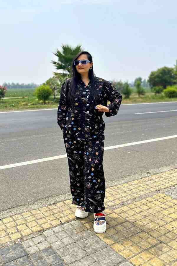 This Black Space Lounge Wear features a loose fit. Top comes with front buttons, a classic collar neck, and full sleeves for a cozy feel. Paired with matching pants, this ensemble is perfect for lounging around in style.