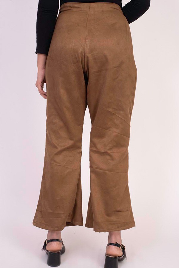 Trendiest of the season brown loose pants and combined with suede, overlap makes this an outfit of all seasons.