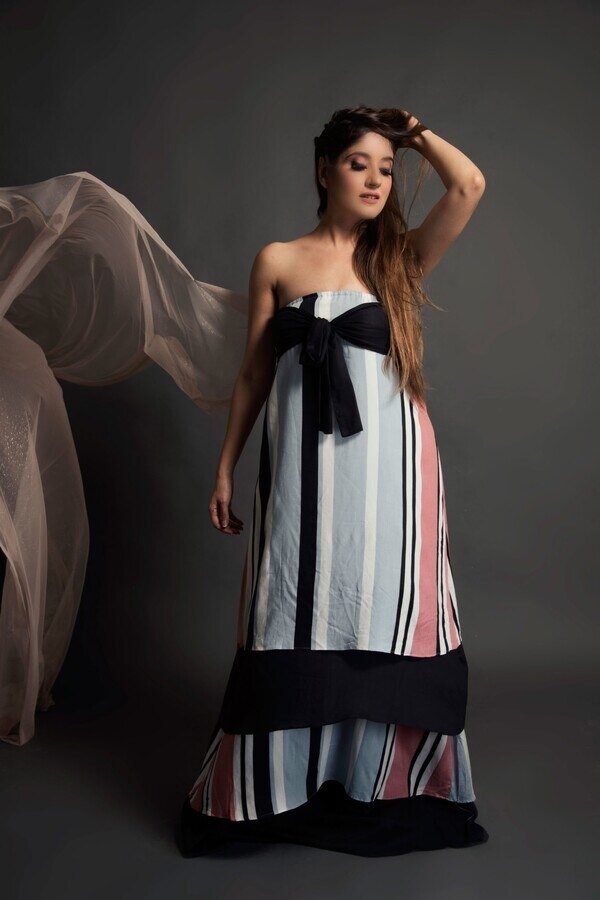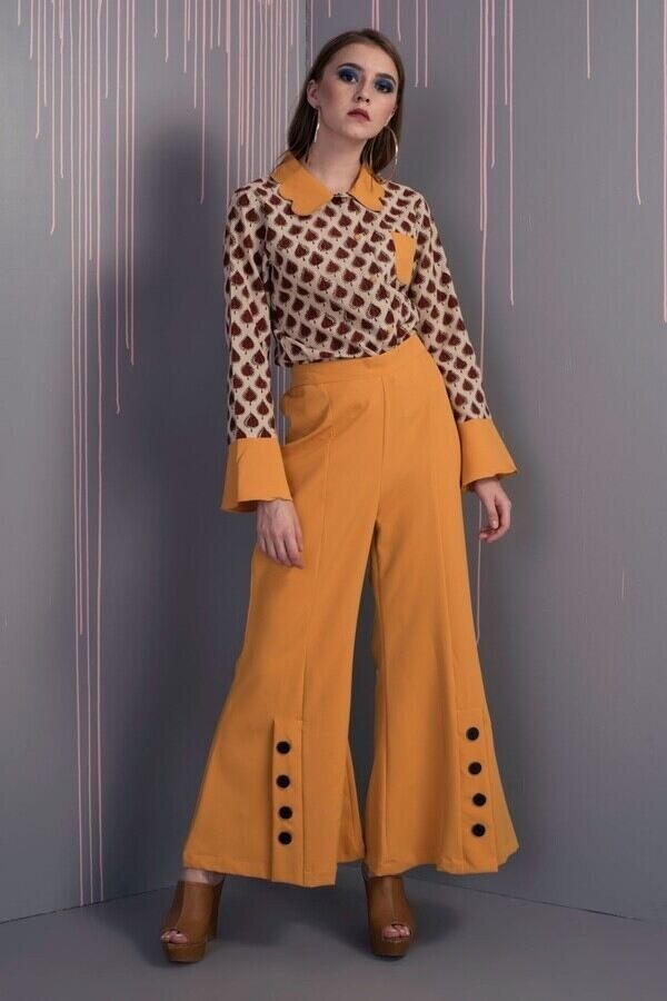 A high waisted bell bottom pants is a wardrobe staple since you do not have to give any thought before wearing this. The elastic high waist and buttons at the bottom gives a voguish look to these basic pants.