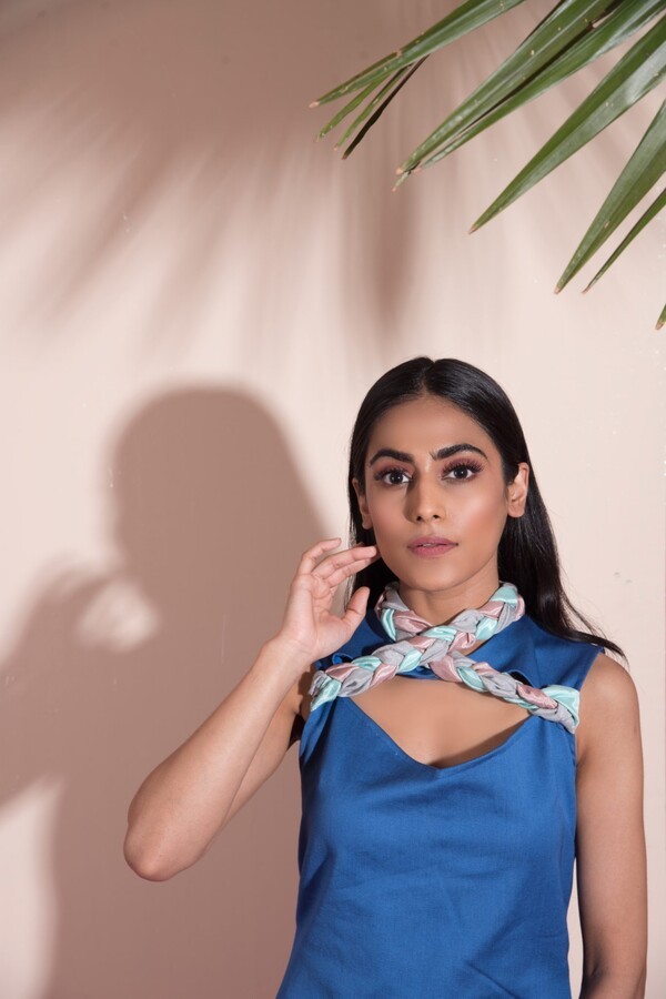 Royal blue denim dress with braids around the neck sums up to a pretty and contemporary dress. The exaggerated neckline adds an element of chicness to the dress.