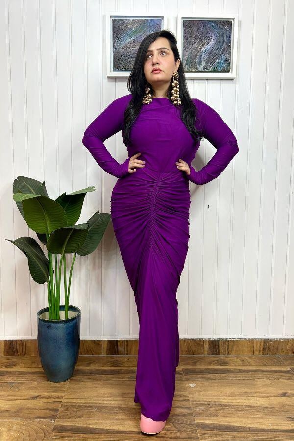 Elevate your wardrobe with the "Orchid Dress". Defined by its boat neck and full sleeves, this dress exudes timeless elegance. The gathered accents create a sculpted effect, complementing the bodycon fit for a flattering finish. With a seamless back zip closure, this dress is designed for moments when confidence meets effortless sophistication.