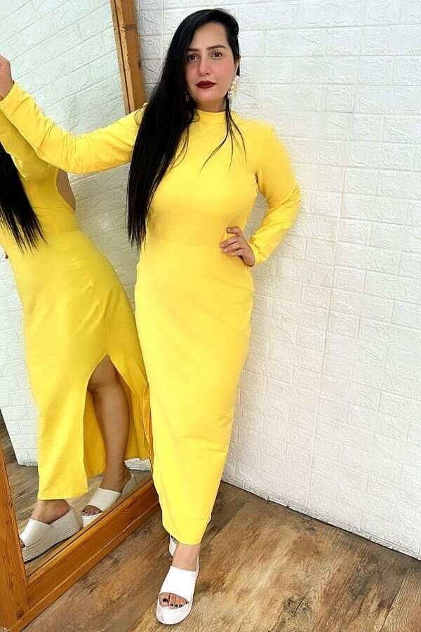 Yellow lycra Maxi Dress with back deep neck to give the elegant look. This party season, ditch your boring outfits and dress up chic and elegantly. Glam it up for a day out with your peeps to leave a mark.