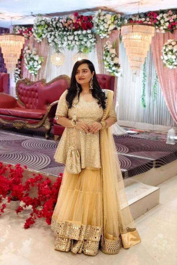 Sunehri Adda Set – A timeless celebration of elegance and artistry. This captivating ensemble features a flattering V-neckline, short sleeves, and a peplum-style silhouette that effortlessly blends tradition with modern flair. Intricate lace detailing enhances its delicate charm, while mirror latkan embellishments add a playful sparkle to your every move. Completed with a coordinated potli, the Sunehri Adda Set is your perfect pick for festive and unforgettable celebrations.